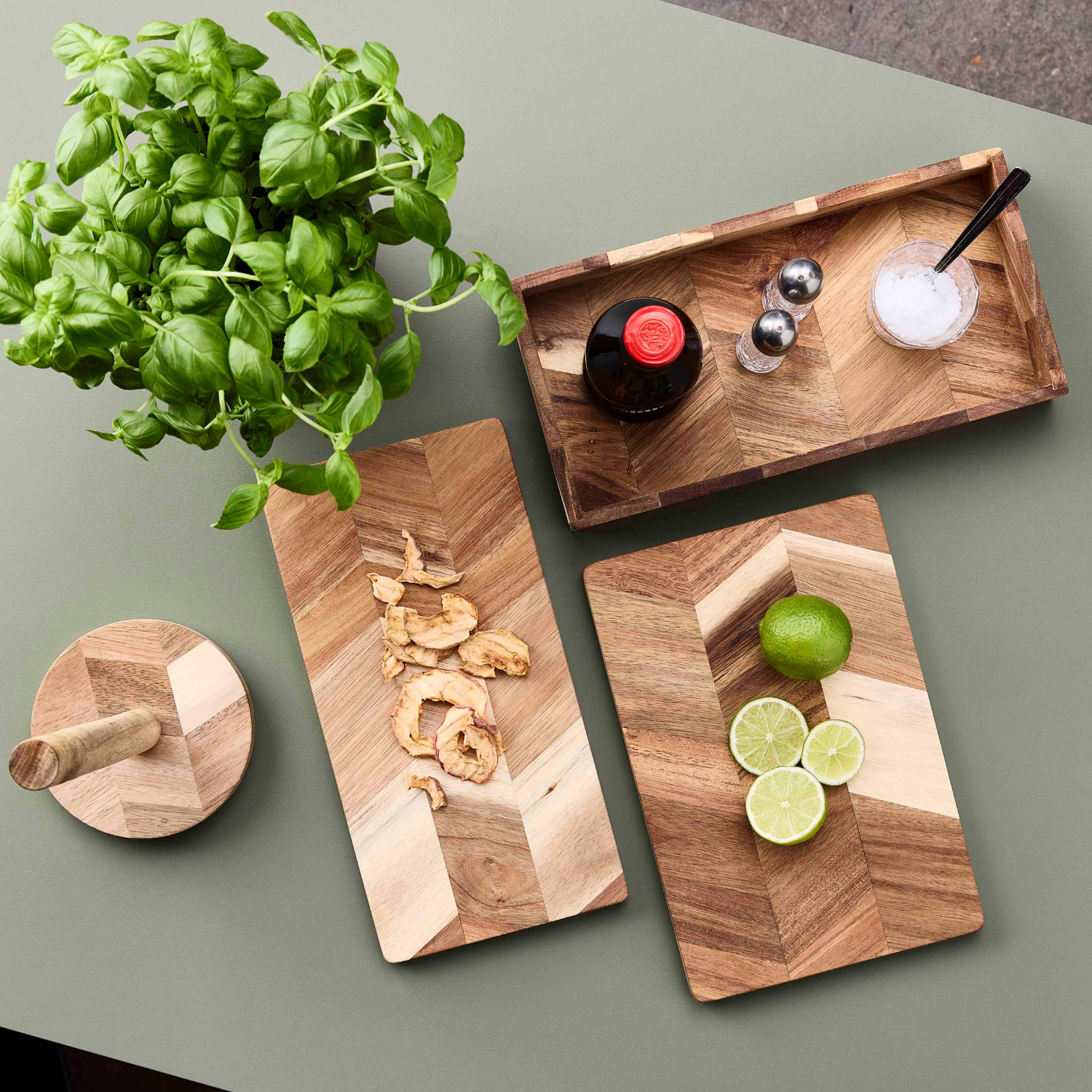 In our collection, Acacia plays an important role as a natural and durable material for kitchen and serving use. Acacia is known for its natural strength and beautiful herringbone patterns, giving each product its own unique character. When cared for properly, it offers a long lifespan. We recommend washing the products by hand, drying them thoroughly and allowing them to air dry completely. To prevent the wood from drying out, it is recommended to treat it regularly with a food-safe oil, which helps maintain its natural glow. Should any odours occur, the products can be refreshed using a mixture of coarse salt and lemon.
